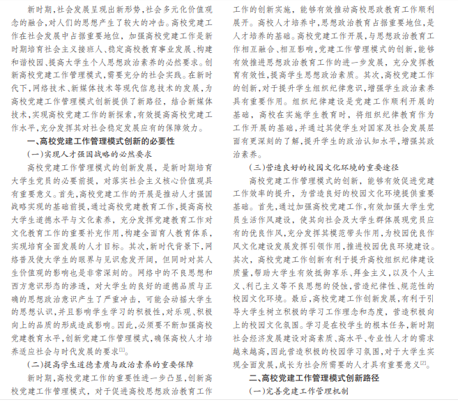 高校作为社会高素质人才培养的主要场所,新时期创新高校党建工作管理模式是保障高校健康发展、实现 育人目标的重要途径。文章明确了现阶段改进高校党建工作管理模式的必要性,对新时期高校党建工作管理模式创新 路径进行了新探索,旨在提高当代高校党建工作水平,为高校发挥思想引导作用提供保障。