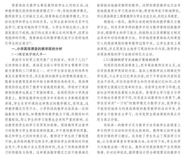 在当今教学活动中,教学方法和模式都在逐渐发生改变,随着素质教育的不断深入,小学英语也要不断调 整教学模式。作为全世界的通用语言,英语早就成为了学生必须学习的一门课程。情景体验式的教学模式可以有效提高 学生的学习兴趣与积极性。英语并不是学生的母语,学生学习的时候比较吃力,学生必须多记单词才可以。情景体验式 的教学可以提高学生学习的积极性,符合学生的学习需求。本文对情景体验式的教学模式在小学英语教学中的应用展 开探讨。