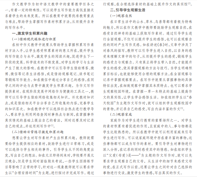 作文教学是培养学生写作能力的重要环节之一,对学生语言表达与思维能力有着促进的作用。因此在初 中作文教学中,要从帮助学生掌握积累写作素材方法入手,利用有效的教育方法来锻炼学生的写作能力,选择适合的写 作方向,提高写作质量。