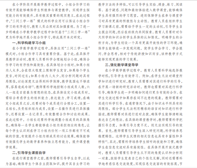 现代社会经济的不断发展对我国教育工作提出了更高的要求,在小学教学过程中,数学是极为重要的一项 基础学科,在具体开展教学活动时,基于“三问三学一练”模式开展小组合作学习能够实现学生数学素养的进一步提升, 推进我国教育工作的有效发展,本文综合探究具体的教学策略。