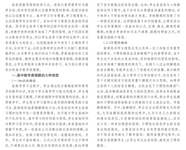 数学属于高中学科的重要科目之一,由于数学科目学习难度大,对学生个人学习能力及知识积累要求较 高,所以很多学生在学习数学的过程中会产生很多问题,在做数学练习题的时候也会出现各种错误,有些错误还会经常 性地出现,某种错误会发生在多个同学身上。针对这种情况,数学教师在教学过程中应当注意总结与积累学生经常做错 的题目,分析易错点,了解易错题产生的原因,采取正确的应对措施,让学生减少这类错误,提高解题的正确性,为学生 的数学学习及身心健康发展起到促进作用。本文从知识性、习惯性及策略性这三个方面对高中数学易错题进行了分类, 并分析了易错题的成因,希望能够为高中数学教学提供一定的参考。