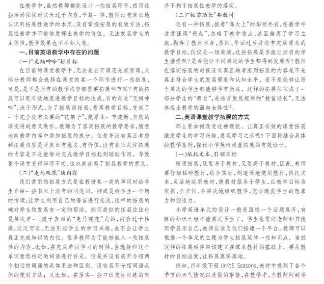 在小学英语课堂教学中,有效拓展是教师利用现有英语教材,从学生英语实际出发,考虑教材内容之间的 联系,对教材的深挖、整合、补充的一种教学方法。教师可以根据具体的教学内容,结合学生的学习实际,设计出多样化 的语言表现形式。我们常将拓展环节放在一节课的最后一步,检测学生运用新知的能力,展示学习效果。
