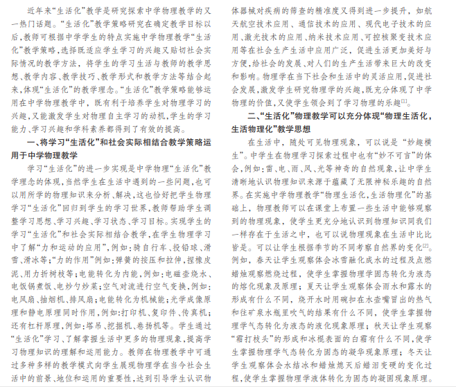 在新课程改革的大趋势下,在中学物理教学中被重视的还有中学生创造能力和运用知识能力的培养,而具 有“生活化”——创新、生动、灵活教学方式的运用可较好地实现这一目标,有效地提升教学效果。因此,在物理教学中, 物理教师应该加强认识并运用“生活化”教学,有效地采用战略推进及教学方法“生活化”教学,更好地实现“生活化”教 学,继而使学生的创造能力和运用知识的能力得到提高。