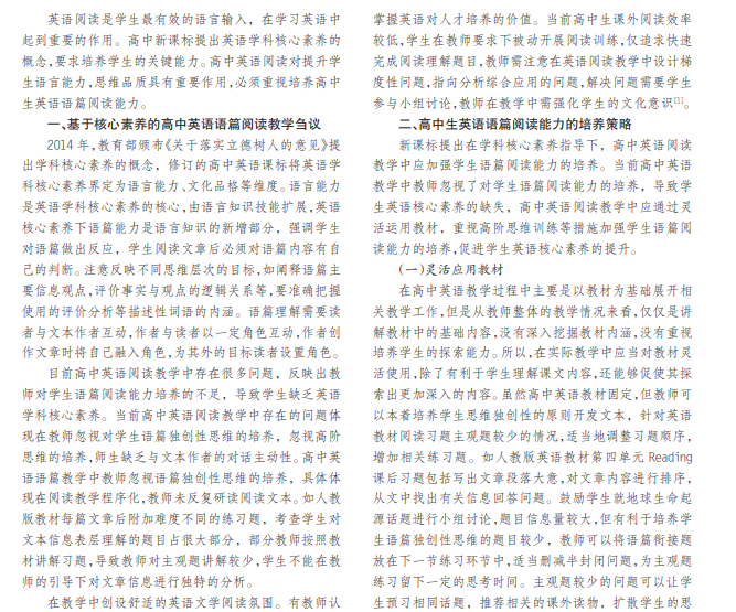 英语阅读能力是学生阅读语言知识在头脑中联想、提取关键信息解决阅读问题的能力,阅读能力可以提高 学生的语言学习能力。在实际教学中,许多学生阅读英文文章存在困难,影响了学生阅读能力的发展。文章论述了英语 核心素养下语篇能力的内涵,对高中生语篇能力培养存在的问题进行分析,提出相应的对策,挖掘人文价值,重视思维 训练,借助最佳关联理论,提升学生的语篇阅读能力。