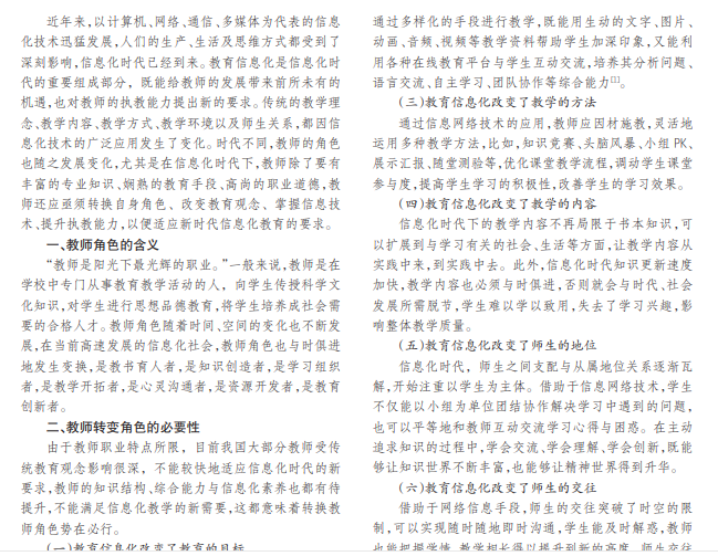 信息化时代的高速发展使教育信息化成为必然,教育教学的理念、内容、方式、环境的变化推动着教师角色 的转变。笔者对教师角色的含义、角色转变的必要性、角色的定位以及转变途径等多方面进行了阐述。