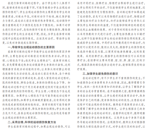 随着经济的不断发展,越来越多的人开始重视体育运动在生活中的重要性,学生家长与教育工作者也开始 重视体育课程,但是在体育训练过程中存在学生运动损伤的问题,运动损伤不仅会对学生的身体带来负面影响,而且也 会直接对学生的健康状况、学习状态产生影响,扰乱学生的生活学习规律。在体育训练的过程中,不同的运动造成不同 的损伤,增加了学生的压力。本文阐述了学校体育训练中运动损伤的原因以及恢复方法。