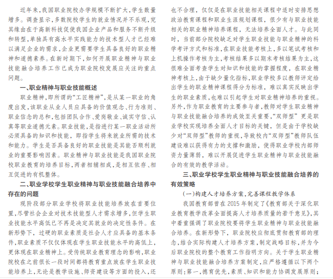 职业教育是我国基础教育的重要组成部分,其主要教育目标是为国家和社会培养中、高级技能型人才。近 年来,我国经济发展迅速,国际科技竞争激烈,人才已成为市场竞争的关键。在此背景下,李克强总理曾在全国人大会议 上提出工匠精神的概念,全国教育大会也强调必须坚持把立德树人作为教育的根本任务,由此可见,职业精神与职业技 能融合培养已是我国职业学校未来教育的主要方向。为此,笔者主要阐述了职业学校职业精神与职业技能融合培养的 有效策略。