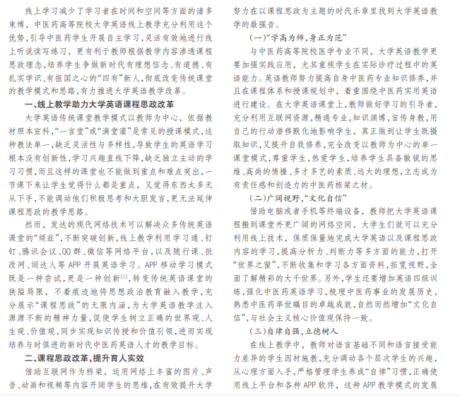 中医药高等院校大学英语线上教学,借助互联网技术以及学习通等网络平台,改进传统英语教学模式,着 力挖掘课程中的思政元素,把握英语教学改革的契机,结合大学生英语学习的具体问题,精心设计线上教学活动,充分 调动学生自主学习的兴趣和热情,启发他们主观的“自律”思维,树立文化自信,高扬爱国主义旗帜,真正实现“立德树 人”的教育目标。