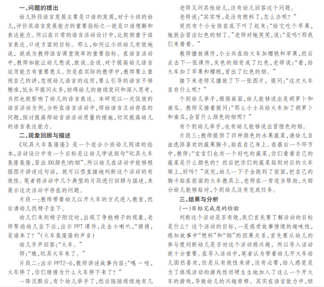 本研究以小班的语言活动《玩具火车轰隆隆》为例,阐述活动过程中存在的问题,并且对问题进行分析,挖 掘其背后的原因,从而提出相应的对策。