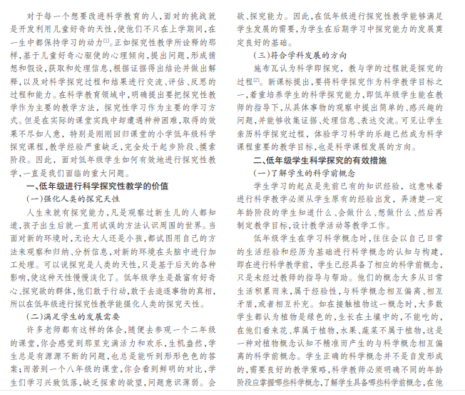 小学科学涵盖了中学生物、物理、化学等学科的基础知识,是引导学生认识自然事物的本质特征、现象及规 律的启蒙学科。小学科学可有效地培养学生的创新思维与创新能力,而科学就是探究,科学教学离不开探究性教学。探 究性教学则是通过培养学生的知识和技能,提升学生的探究能力与知识的实际应用能力,让学生能够获得真实的情感 体验,对全面发展学生的科学素养具有重要作用。本文分析了小学低年级进行科学探究性教学的价值,提出了小学低年 级学生科学探究的有效措施。