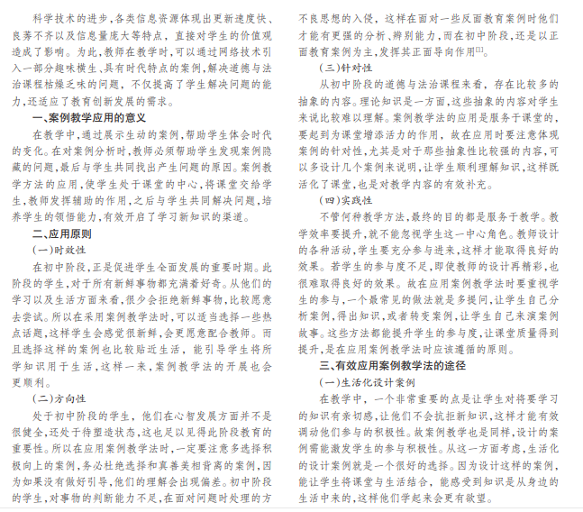 在初中学习阶段中,道德与法治是最基本的课程,在一定程度上影响着学生良好品德的养成和正确人生观 的确立。随着教育改革工作的推进,社会更加需要复合型人才,使道德与法治课程面临更严峻的考验。加之初中道德与 法治课程无法贴近学生的实际生活,学生很难产生亲近感,无形中增加了学习的难度。对此,教师借助案例推进教学工 作,保证教学质量。