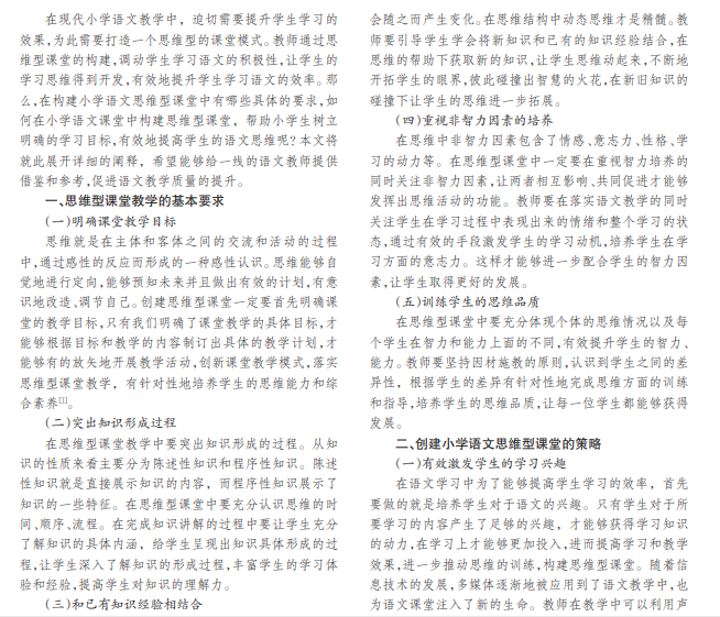 在课堂教学中,教师和学生之间最核心的活动就是思维活动。小学语文教学希望构建思维型课堂,通过认 知的冲突、自我建构和监控以及应用的迁移来让学生的智力获得提升,促进师生之间的良好互动,最终提升小学语文课 堂的教学质量。为此,本文将对构建小学语文