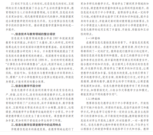 随着计算机和互联网的普及,信息化教学手段在课堂教学中的应用越来越频繁,为教育领域带来了变革的 动力。信息化教学手段在中小学课堂教学中的应用,使传统课堂焕发出新的生机,以逼真的视觉效果呈现抽象的课堂教 学内容,提高课堂教学的质量和效率。本文从信息化教学手段入手,分析并探讨信息化教学手段在中小学课堂教学中的 运用,希望可以为提高中小学课堂教学水平提供一些参考。