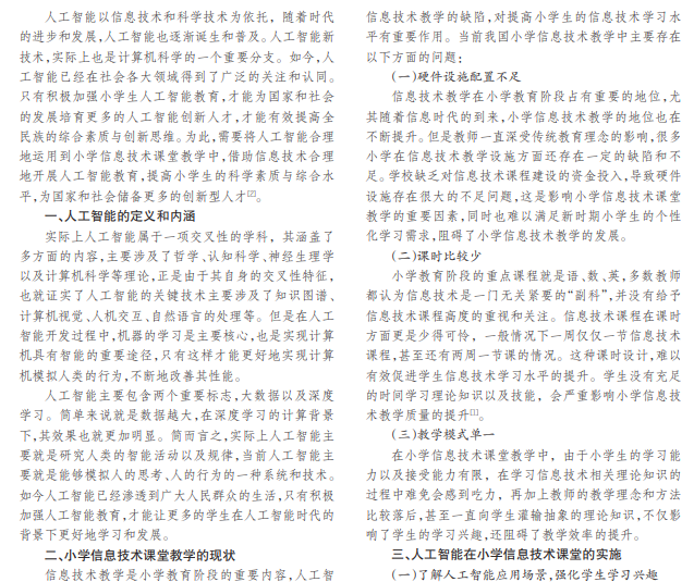 随着我国科学技术以及信息技术的发展,人工智能也迅速得到了的应用。在这样的背景下,人工智能已经 有效地融入社会的各个领域,同时也深入广大人民群众的生活中,积极加强人工智能教育已经势不可挡,人工智能教育 应该从青少年抓起,为国家和社会培育更多的创新型人才。如何将人工智能合理地融入小学信息技术课堂教学,是当前 的一大重要任务。这不仅是实施人工智能教育的有效策略和途径,也有利于提高小学生的科学素质与创新能力,本篇文 章主要分析人工智能在小学信息技术课堂教学中的实施。