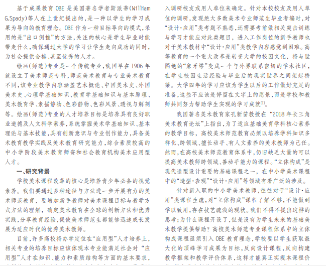 本文旨在以美术师范专业核心课程《立体构成》为依托,围绕 OBE的教育教学理念,以学习产出为导向,采 取以“以生为本”的课堂教学模式,从研究背景、立体构成课程教学目标、课堂教学环节、课堂教学质量评价机制等方面 出发,探讨研究应用型高校在 OBE教育模式下如何改革创新课堂教学模式,为应用型高校 OBE教育改革提供借鉴,使绘 画(师范)专业改革真正得以实施。
