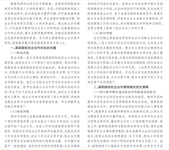 高职院校作为培育应用型人才的主要场所,学校需要重视并将培育人才作为主要的教学目标。要通过校 企合作提高学生的实践能力,促使学生成长为应用型人才。高职院校教师要更新自身的教学思想与教学方法,结合行业需 求与未来发展的方向探索,通过多方的共同努力,推动校企合作的培育模式,培育更多满足时代建设需求的技术型人才。