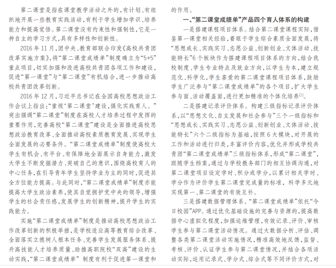 本文依托“第二课堂成绩单”这个载体,结合《高校共青团改革实施方案》的相关要求,把第二课堂人才培 养与第一课堂相结合,将“第二课堂成绩单”制度纳入我校人才培养体系,切实地做好对当代大学生的思想引领。结合我 校实际情况制定《郑州铁路职业技术学院“第二课堂成绩单”制度实施办法(试行)》,以学生为本,科学多元、精准高效、系 统规范地搭建四个育人体系,通过四个体系的协同运行,最终形成“名称统一、科学规范、符合学生需求、实用性高”的 “第二课堂成绩单”产品。