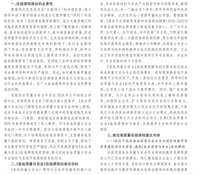 《食品质量与安全》是我校食品质量与安全专业的核心课程,是关于食品从农田到餐桌整个过程中的质量 控制及其相关理论的一门课程。随着高等教育的改革,线上线下混合式教学模式显著地提升了课堂教学质量。本文就如 何建设高质量《食品质量与安全》在线课程以及建设过程中存在的问题进行探讨。