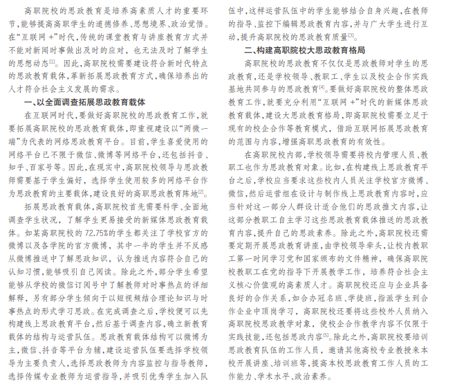 “互联网 +”时代对学生的思想状况产生了巨大的影响,提高了高职思政教育的难度,也为高职思政教育带 来了新的机遇。在“互联网 +”时代,传统的思政教学方法过于严肃与严谨,与当代高职学生的学习认知规律并不相符。 因此,高职院校领导与思政教师需要充分利用时代特色,通过对学生进行调查、优化教学载体、拓展教学场所、开展实践 思政活动等方法,以多种渠道对学生实施更广泛的思政教育,并提升思政教育的实效性。