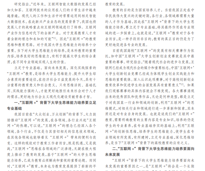 对大学生思维能力的培养,是本科教育的重要内容。培养良好的思维能力,有利于提高大学生的综合素质, 在不同专业领域实现人生价值。当前,“互联网 +”的思维模式和培养模式,已经成为大学生思维能力培养的重要途径和 手段,基于“互联网 +”的大学生思维能力培养,要立足于专业基础,向未来发展,深化实践探索,真正实现对大学生综合 素质的塑造和思维能力的全面提高。