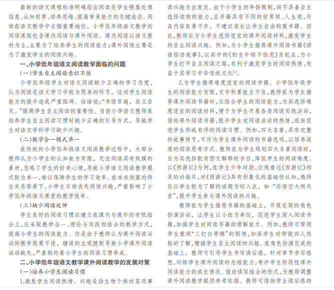 本文简要分析了小学低年级语文阅读教学面临的诸多问题,学生自主阅读习惯尚不成熟、教学合一模式 较为单调、缺少课外阅读延伸,并在此基础上提出了小学低年级语文教学课外阅读教学的发展对策,培养小学生良好的 阅读习惯、实现教学合一的教学理念等,以促进小学低年级语文教学的发展。