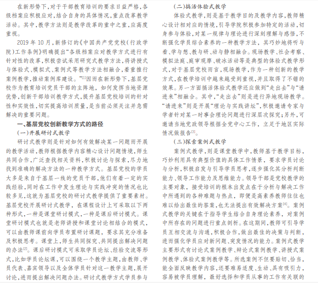 对于档案教学改革而言,教学方式是重点,备受关注,基层党校也不例外。本文在分析基层党校创新教学 方式路径的基础上,对基层党校创新教学方式过程中容易出现的问题进行相应的阐释,希望能为基层党校教学改革提 供有价值的参考。