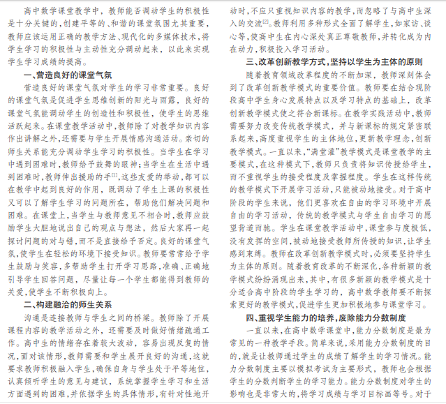 数学是高中教育中一门重要的课程,直接影响高中生的学习成绩。作为一门基本课程,它不仅是理论研究 课程,还是一门实用性非常强的学科。本文对如何提升学生的积极性进行探讨,提出教师应采取营造良好的课堂气氛、 构建融洽的师生关系、调动学生的积极性、注重现代媒体的运用等措施,实现高效课堂教学。