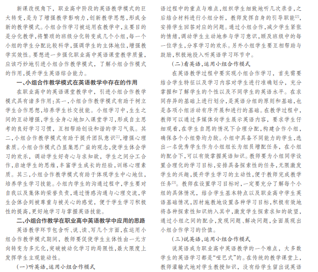 本文主要阐述小组合作教学在职业高中英语教学中的作用,结合当下英语教学改革的发展趋势,首先分 析小组合作教学模式在英语教学中的作用,其次从运用小组合作模式听英语、看英语、说英语、读英语、写英语、评英语 几个方面深入说明并探讨小组合作教学在职业高中英语教学中的应用思路,有效提升职业高中英语教学质量,意在为 相关研究提供参考资料。