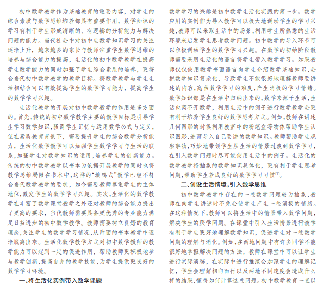 随着社会的进步与人们生活水平的提高,初中生的教育逐渐引起了社会的广泛关注。初中数学作为初中 生学习的主要科目之一也引起了社会与教育者的思考。面对抽象的数学问题如何吸引学生的学习兴趣是广大一线教师 一直关注的问题,本文从初中数学课堂教学的实际出发,分析不同教育方式下学生的反馈,指出当代初中数学教育要与 生活实际联系,全方位推行数学教育生活化,让学生学会在生活中运用数学,积极学习数学知识。