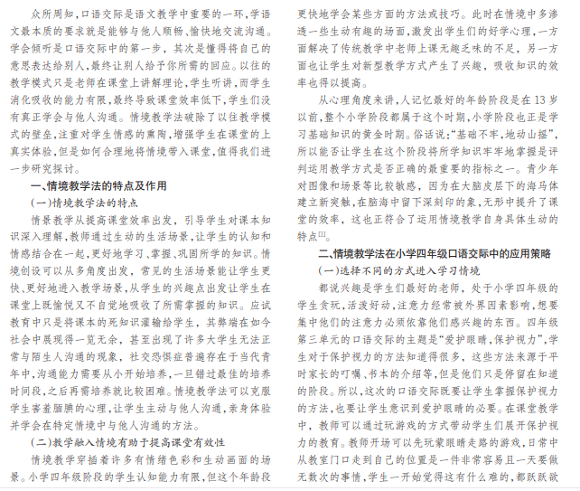 近年来,我国教育改革不断深入优化,学生们接触的思想文化每年都在更新发展,尤其是对于正处在小学 时期的未成年群体,他们接受的知识百分之八十都来源于课堂,在从小的耳濡目染之下,学生的口语表达交际能力会得 到提升。情境教学从与教学内容相关的生活场景出发,联系生活和课堂,达到加深教学影响的目的。本文分析小学四年 级口语交际情境教学法的应用,延伸至整个小学阶段采用类似的情境教学方法是否能起到积极作用,以期为相关研究 提供参考。