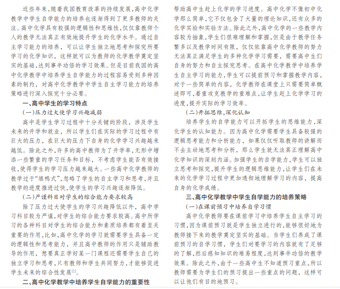 培养高中生的自学能力,不仅可以提高学生独立思考和探究的能力,还可以帮助学生更好地理解相关的 化学知识,并且有利于教师有针对性地讲解重难点知识,促进高中生化学成绩的有效提升。但是在高中化学教学中学生 自主学习能力的培养依然存在许多的缺陷和问题。本文将对高中化学教学中如何培养学生的自主学习能力进行全面的 分析与研究,然后提出相应的对策,以此提高高中化学的教学质量,促进高中生未来更好的学习和发展。