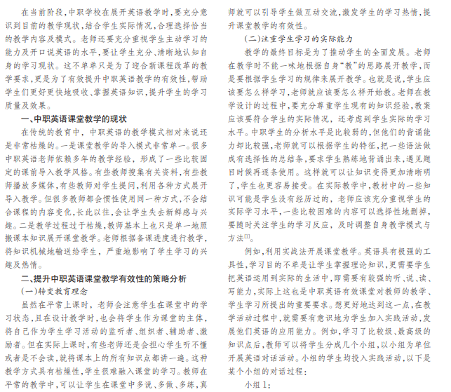 作为中职学校的英语老师,常常需要思考为什么明明教得非常艰辛,学生也学得非常艰辛,但是实际的教 学效果却不是非常理想,许多学生掌握运用的英语知识非常有限。本文分析了中职英语课堂的现状,提出了提升课堂教 学的策略,在实际的教学中,老师应该要重视自身的教学行为,真正实现高效的教学课堂,关注学生知识认知水平与能 力发展。