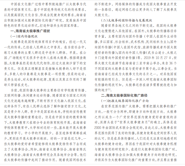 随着全民健身意识的盛行,海南省对太极拳高度重视,尤其在世界化思潮不断推进以及“一带一路”方针政 策不断践行的背景下,海南省开始国际化推广太极拳。本文主要从海南太极拳从其他国家推广的现状角度出发,深入且 全面地探讨了提升海南太极拳国际化推广成效的具体路径。