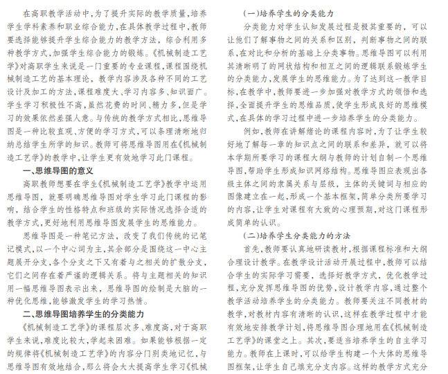 在现阶段的高职教学活动的过程中,教师要结合相应的教学内容,加强培养学生的学科素养,全面提升学 生的思维能力和综合品质。《机械制造工艺学》是高职教学中的重要专业课程,课程内容综合性强,涉及了各种制造方法 和过程,加上学生的实践操作机会比较少,学生学起来难度大、内容多,记忆起来也很吃力,不论是掌握具体知识内容还 是应用知识都有所欠缺。本文通过在《机械制造工艺学》教学中利用思维导图,发现思维导图对提高学生学习能力、培养 学生思维能力有着重要的影响。