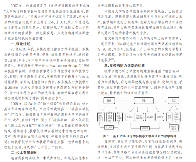 听说能力是大学英语语言学习者应具备的核心能力,但各个学校学生的特点和需求都不相同,本文在分 析本校学生听力学习的特点后,基于 POA理论,结合多模态理论,探索构建英语听力课堂的模式,期望能够解决目前听 力课堂存在的问题。