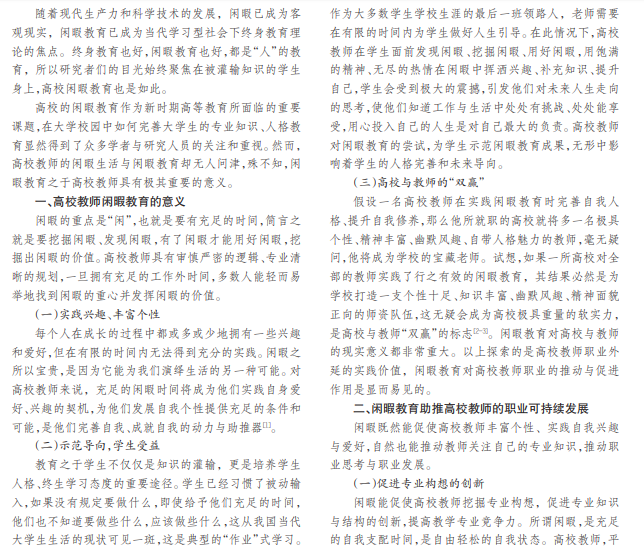 闲暇教育能促使高校教师对其职业生涯的可持续发展进行深入、长远的思考,保持职业生命力。闲暇教育 对于高校教师是学术灵感的补充、自我个性的修复、是职业热情的焕发、职业“留白”的审视,对高校教师的职业生涯发 展产生积极的推动作用。本文探讨了高校教师闲暇教育的意义,以及闲暇对高校教育可持续发展的作用。