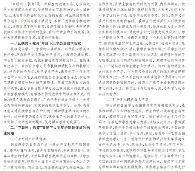 在互联网技术的影响下,许多专家、学生都喜爱和重视“互联网 +”这一新型教学形式,如慕课、翻转课堂 等,并逐渐扩大至世界各个领域,在新型教学模式的帮助下,学生可以更加深入地了解和掌握知识,不断提高学习的积 极性和学习热情,提升学习效率。本文以“互联网 +教育”为背景,探讨大学英语教学翻转课堂的构建策略。
