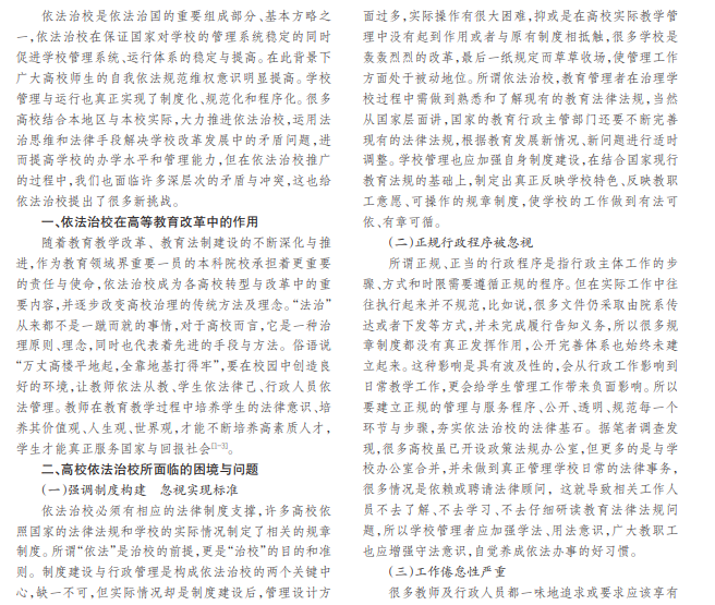 依法治校是依法治国战略部署中的重要组成部分。依法治校指的是以“法”作为武器加强对学校的管理, 即管理与服务二者结合,达成学校管理和运行机制的规范化、制度化,以遵循法律的规定对学校工作实施法治与科学化 管理。本文以行政管理工作为切入点,探讨如何在法治前提下引领教育改革走向健康、持续发展的新轨道,切实发挥依 法治教、依法治校在高校行政管理、教学管理、学校文化体系建设的引领作用。