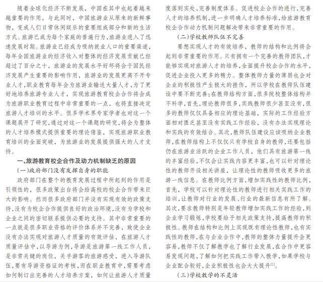 随着旅游出行在人们的生活当中占据着越来越大的比重,旅游业也成为国民经济发展的重要支柱产业。 在新的时代条件下,旅游人才需求量在不断上升,但实际培养出来的人才数量却相对较少,如何更好地实现旅游教育将 会成为培养旅游人才重要的方式和途径。本文将会对旅游教育校企合作动力机制进行分析,为人才培养水平提供必要 的理论支持,加强旅游人才的建设,实现旅游业的不断发展。