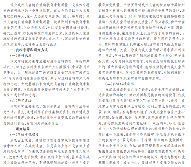在社会主义教育事业中,特殊教育是一个重要构成。随着“以人为本”教育理念的实施,随班就读教育也得 到快速发展,其教育康复质量受到社会的广泛重视,不断提高残疾儿童随班就读教育康复质量,是随班就读教育工作者 需要持续研究的课题,要对残疾儿童随班就读教育康复质量的影响因素进行研究。本文以此为立足点,采取案例分析 法、资料查阅法等方法,就残疾儿童随班就读教育康复质量的影响因素展开探讨。