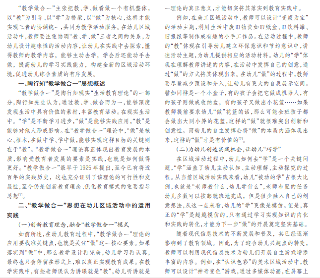 陶行知先生所提出的“教学做合一”思想,强调了教、学、做三者的有机融合。在幼儿区域活动中,“教、学、 做”相结合能够促进幼儿手脑并用,具有积极的借鉴意义和指导价值。本文探讨了通过教师精心的“教”和幼儿用心的 “学”,最终能够落实到“做”上,也就是促进幼儿创新实践能力的发展,在充分发掘幼儿美术教学内涵的同时,促进幼儿 美术活动中教、学、做的真正合一。