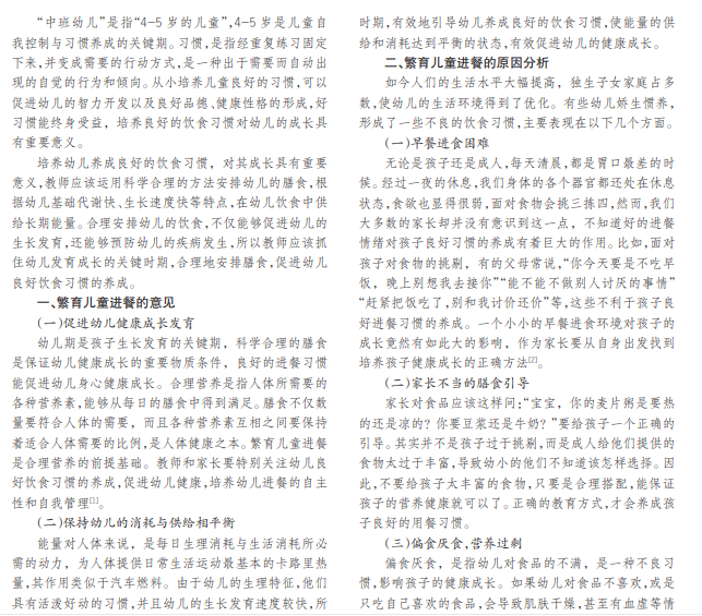 幼儿期是良好饮食习惯养成的关键期,这一时期孩子的身体发育迅速,需要吸取许多营养物质,培养良好 的饮食习惯对幼儿健康成长至关重要。本文针对儿童进餐的意见以及原因进行分析,提出培养中班幼儿良好饮食习 惯的措施,如儿童保健用餐的风俗、提高儿童用餐条件保证合理营养、培养儿童用餐礼节等,有效培养中班幼儿良好的 饮食习惯。