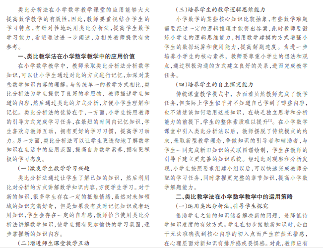为了不断提高数学教学水平,作为小学数学教师,要有效地应用类比分析法,帮助学生探究数学知识点,培 养学生的良好数学思维能力。本文结合教学实际,深入总结了类比分析法在数学课堂的实践应用对策。