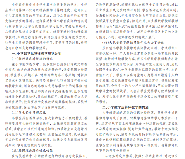 小学数学的运算律是在数学运算过程中运用到的运算规律,理解与运用运算律,可以提高数学的运算速 度。对于小学生而言,掌握数学运算律的方法可以为以后的学习奠定基础。小学数学运算律的教学方式很重要,教师总 结工作经验和构建新颖教学模式相结合的方式可以实现数学运算律教学目标。因此,文章探究小学数学运算律的教学 现状、内涵与价值,让更多的家长和教师重视小学数学运算律教学。