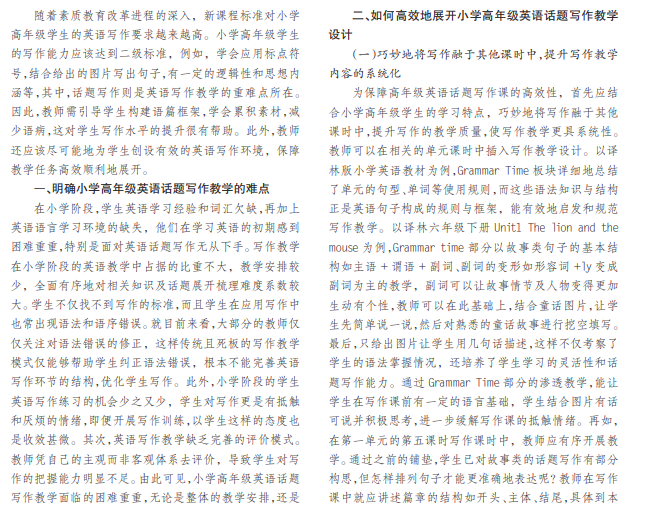 小学教育阶段是我国素质教育的起步阶段,当然也是黄金阶段,这个时期需注重传授孩子正确的学习方 法与价值观念,并充分发掘其学习潜力。在英语学习上,主要分为听、说、读、写这四个部分,“写”考察了学生综合的语言 运用能力,也是在听、说和读的基础上展开。在小学阶段,学生已经初步接触到英语写作,特别是小学高年级的学生应熟 悉英语话题写作。但是,由于学生的英语写作学习经验和词汇表达能力的欠缺,所以写作对他们来讲难度系数较大。本 文以译林版小学英语为例,探讨了高年级英语话题写作教学设计,提出教师需要结合实际情况对高效开展英语话题写 作进行教学设计,努力提升小学生的英语写作水平,强化写作学习兴趣,提升英语综合素养。