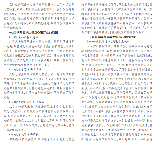 在职业中专的众多学科当中,数学是教师和学生们公认最难理解和学习的一门学科,许多职业中专的学 生数学基础都比较薄弱,如果没有形成正确的学习习惯,会让学生产生倦怠心理。针对这一现状,本文结合自身实际教学 经验,就如何有效开展职业中专数学教学提出一点看法,希望能够调动学生的学习兴趣,并为其他教育工作者提供参考。