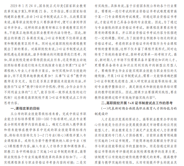 为实施国务院最新印发出台的《国家职业教育改革实施方案》的新要求,高等职业教育新一轮的课程改革 实施势在必行。本文探讨了新时期高职院校课程改革开展的目标,就课程改革如何与 1+X证书制度改革相融合,并开展 试点工作提出了几点思考。