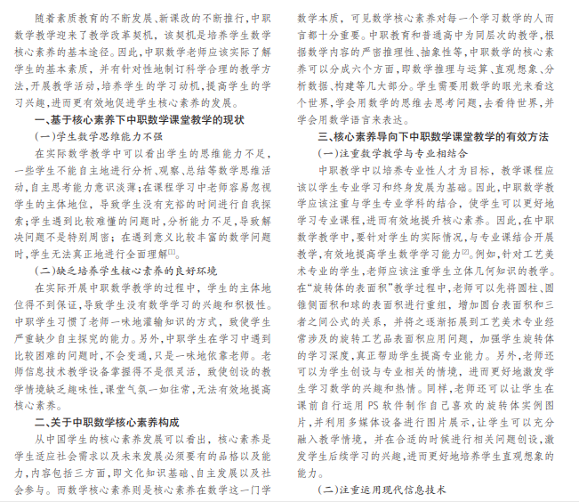 本文以核心素养导向下的中职数学课堂教学为切入点展开具体分析,并以此为依据分析基于核心素养的 中职数学课堂教学的现状、找到核心素养导向下中职数学课堂教学的有效方法,通过注重数学教学与专业相结合、注重 运用现代信息技术、注重教学情境的优化等,激发学生学习数学的兴趣,调动学生学习数学的积极性和热情,进而更好 地培养学生数学核心素养,提高中职数学课堂教学质量。