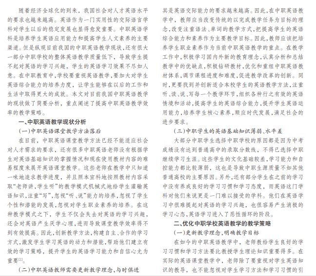 中职教育是推进我国教育改革的重要途径,也是为社会输送更多技能型人才的主要教育阵地。英语学科 是中职教育的一门主要学科,英语教学对促进中职学生的身心健康全面发展,提升学生的综合素质都有重大帮助。中职 英语老师要顺应新时代的发展需求,及时发现目前中职英语教育中存在的问题,并且采取有针对性的措施。本文分析了 中职学校英语教学现状,有针对性地提出了提高职英语教学的策略。