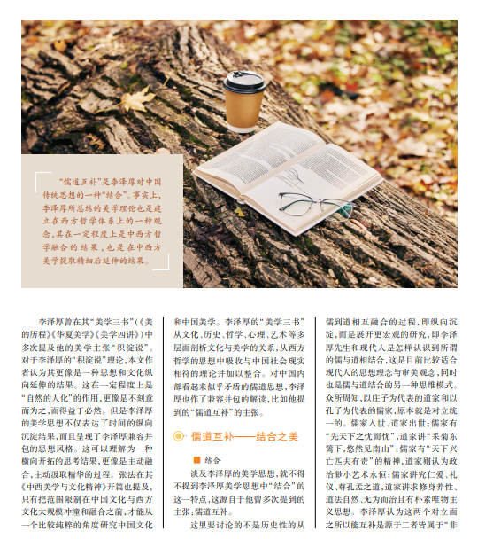“儒道互补”是李泽厚对中国 传统思想的一种“结合”。事实上, 李泽厚所总结的美学理论也是建 立在西方哲学体系上的一种观 念,其在一定程度上是中西方哲 学融合 的 结 果 ,也 是 在中西方 美学提取精细后延伸的结果。